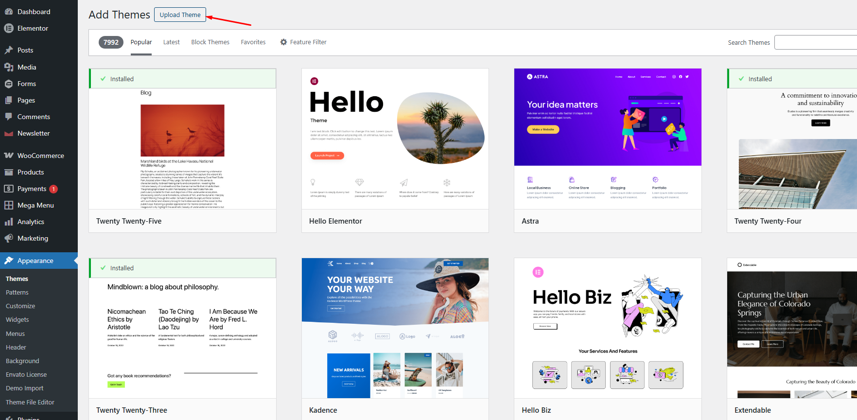 - You will see the Themes page with your currently installed themes.