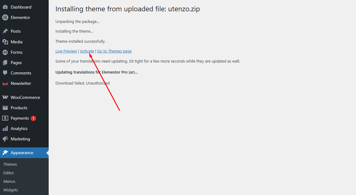 - Click the Activate link to activate Utenzo theme on your site.
