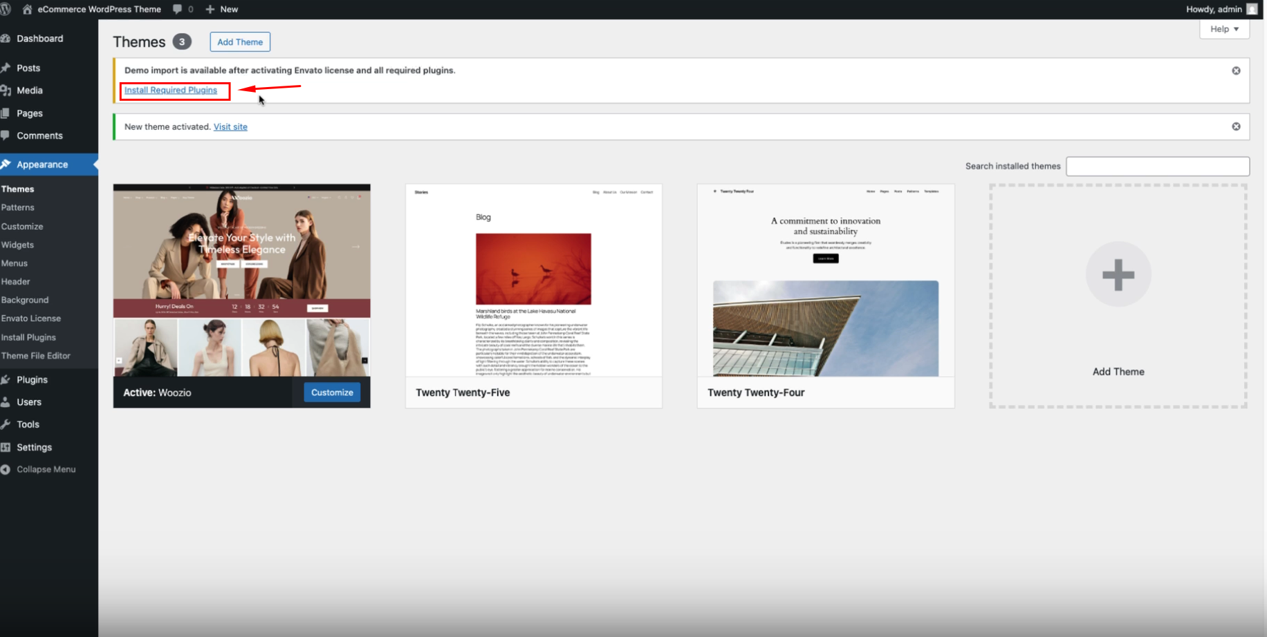 After activating the Woozio theme, you will see a notice on the Themes page indicating that demo import is available after activating Envato license and all required plugins.