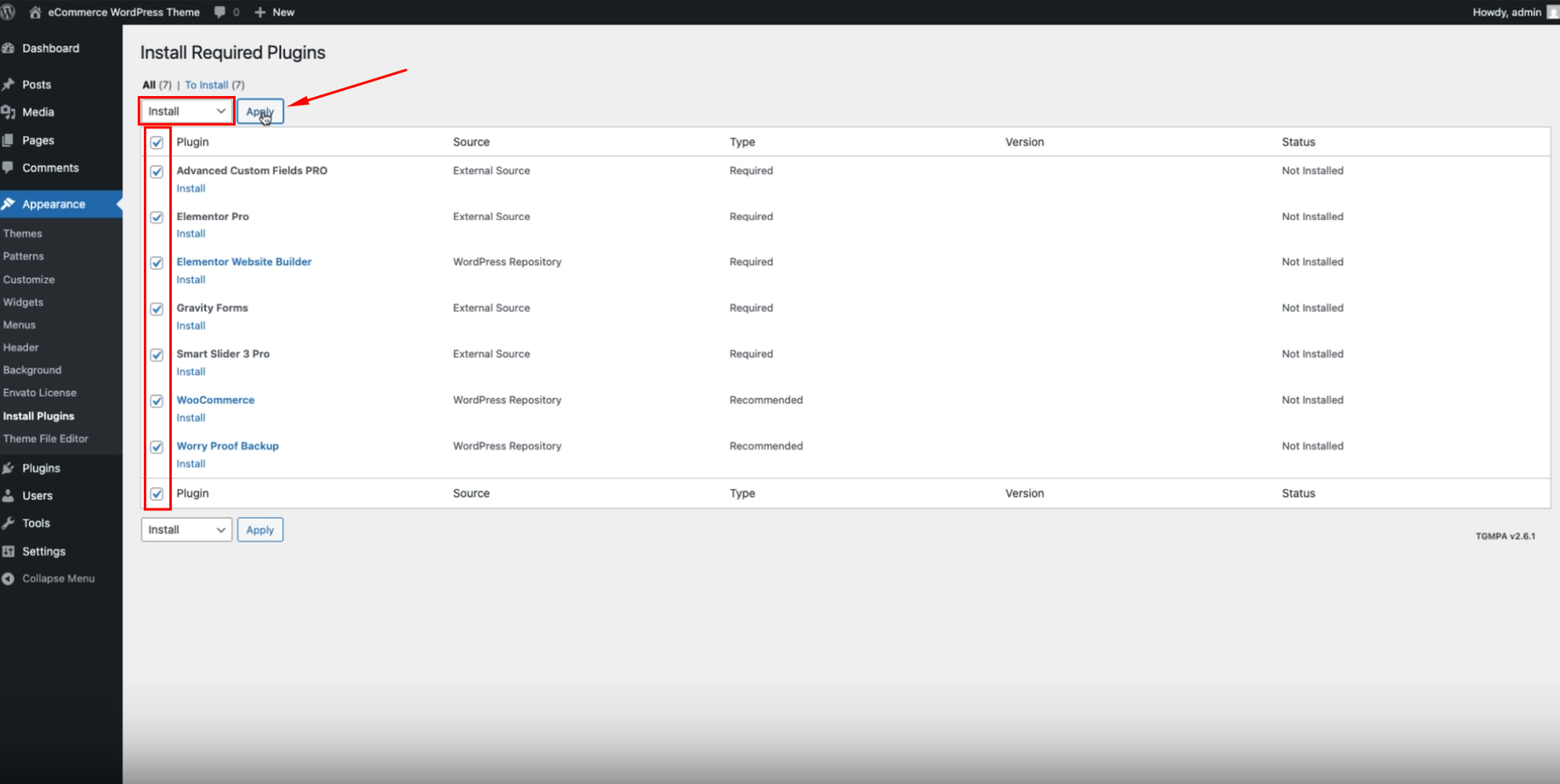 - On the "Install Required Plugins" page, you will see a list of all plugins that need to be installed.