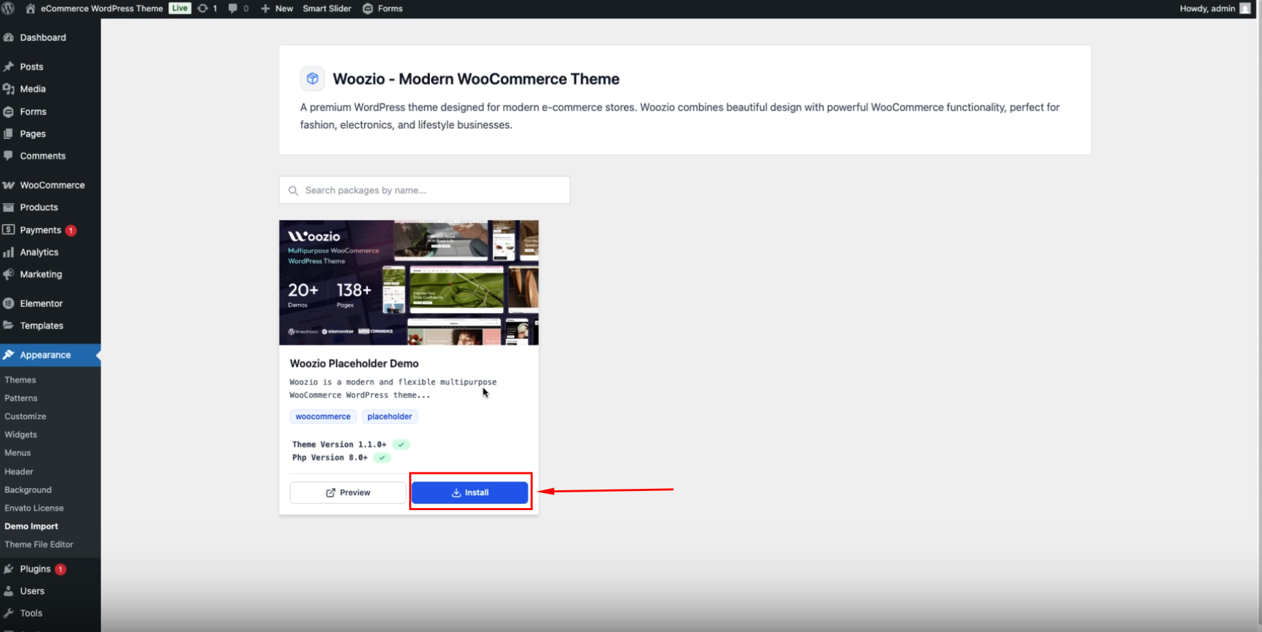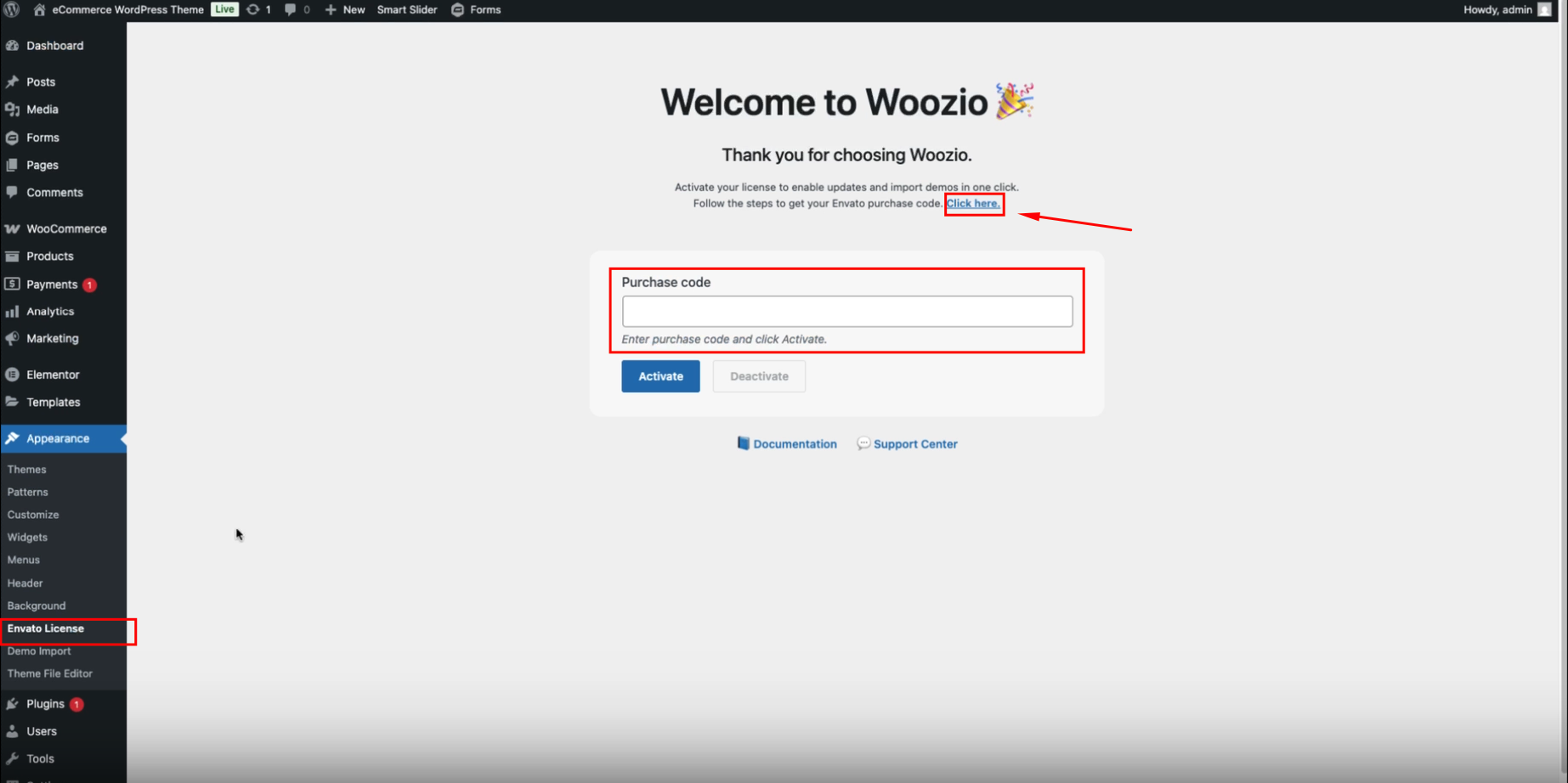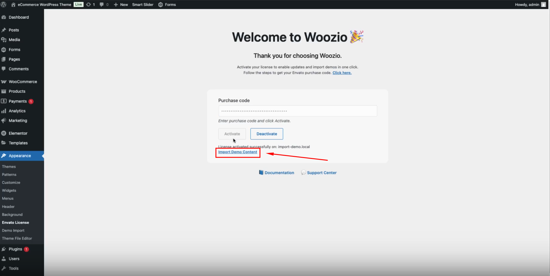 To access demo import functionality, you must first activate your Woozio theme license. License activation enables premium features, automatic updates, and one-click demo imports.