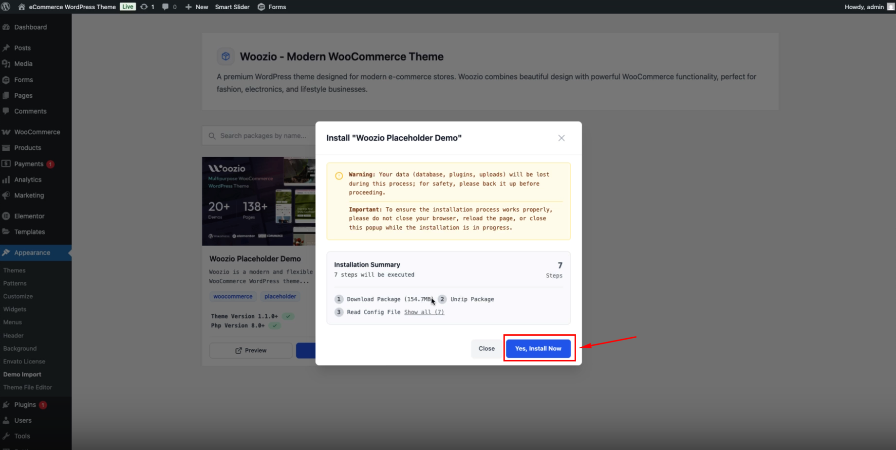 Critical: Do not refresh the page, close the browser tab, or close the popup during import. Large demo packages with many images can take 5-15 minutes to complete, depending on your server speed and internet connection. The installation process must complete uninterrupted.